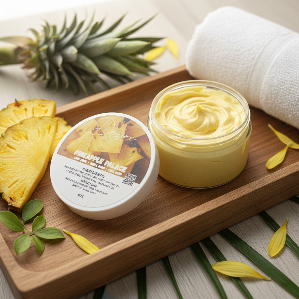 Experience the nourishing power of Pineapple Palace, a shea butter moisturizer infused with a refreshing pineapple scent. This rich formula deeply hydrates your skin, leaving it smooth, radiant, and glowing. Ideal for daily use, it enhances skin’s natural shine while providing a delightful fragrance and a luxurious feel. Perfect for those seeking expert-level skincare with a tropical twist.